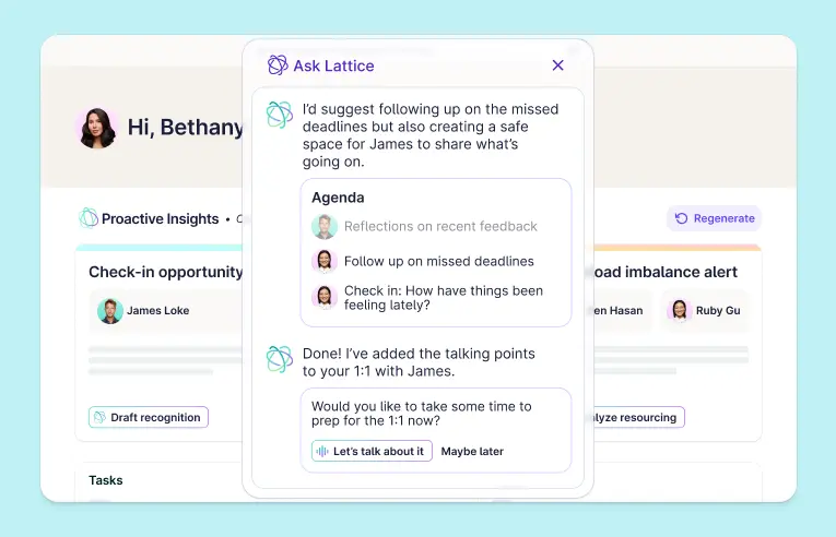 If a manager is stuck, Lattice 1:1s provides AI-powered talking points that suggest smart, relevant prompts on topics such as growth, recent feedback, or performance. Other Lattice AI features include Meeting Assist, which keeps track of meeting notes and next steps so managers can focus on coaching. Lattice also makes it easy to schedule and manage cross-functional and skip-level one-on-ones to support collaboration and transparency across teams.