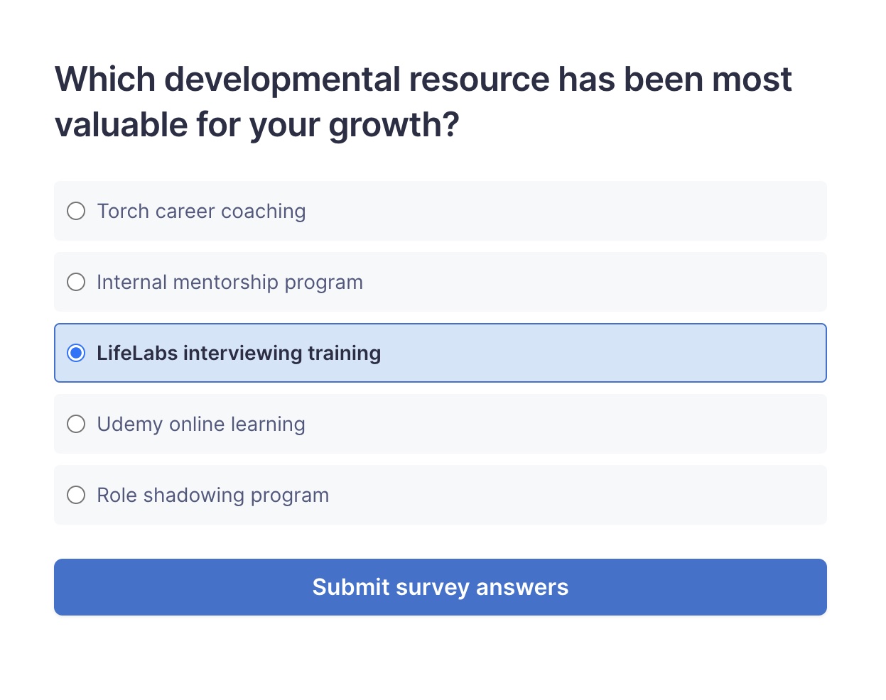 Multiple-choice questions are just as valuable, though they offer a different set of benefits. Offering respondents a range of answers opens the door to more specific feedback. Going back to the example shared earlier, two subsequent multiple-choice questions might ask employees to indicate which career development programs they found the most and least impactful. Combining Likert and multiple-choice questions in this manner opens the door to a much richer analysis.