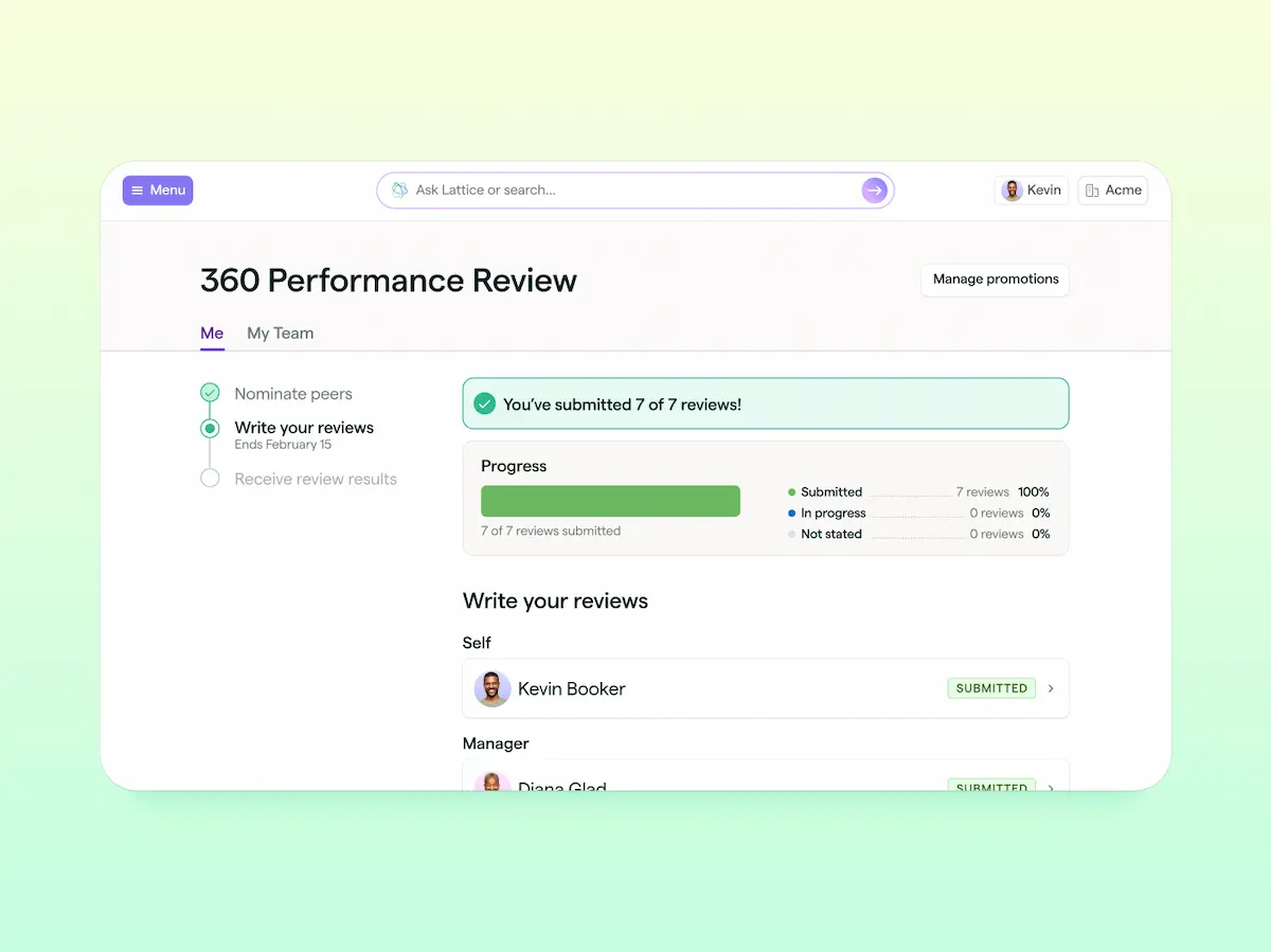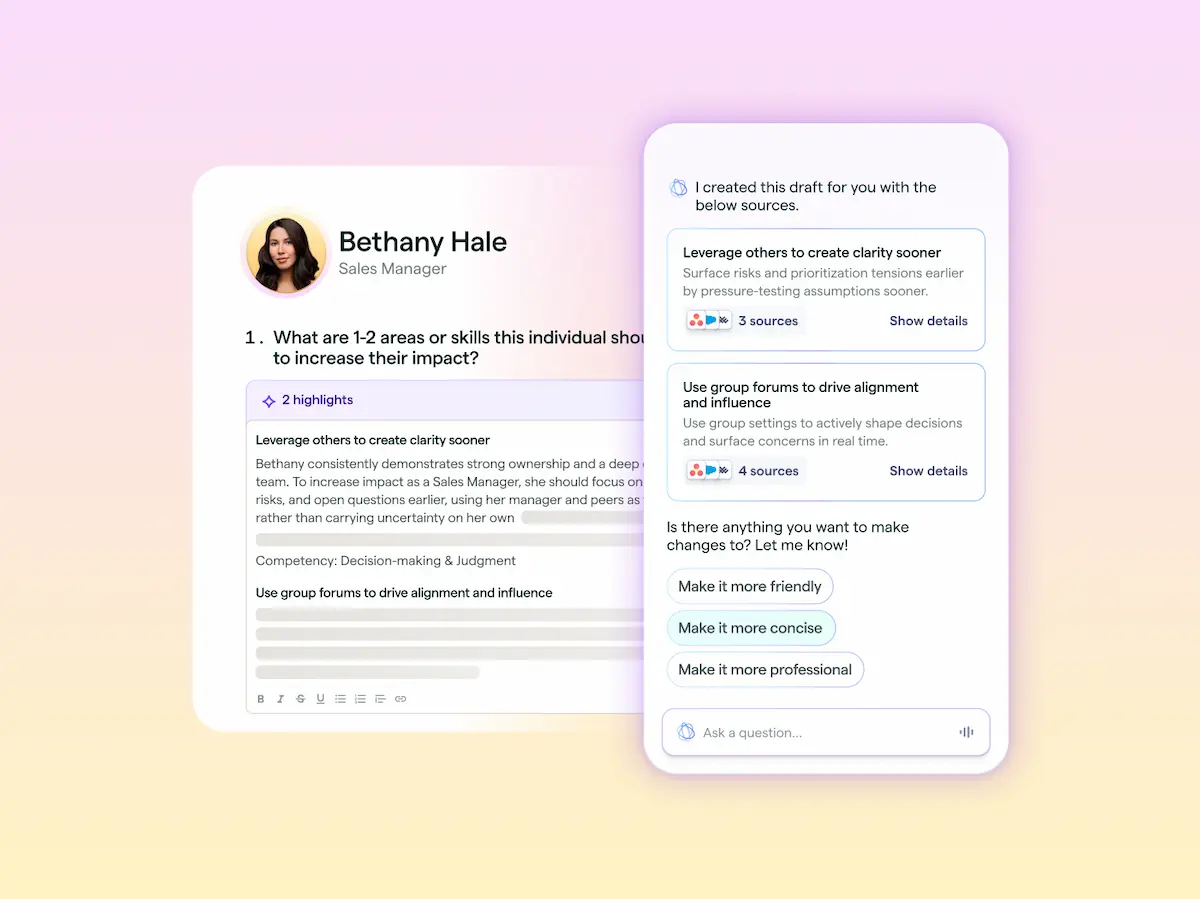 Elevate reviews and bring consistency to performance conversations with AI-powered drafts grounded in data from goals, growth progress, updates, feedback, and 1:1s.