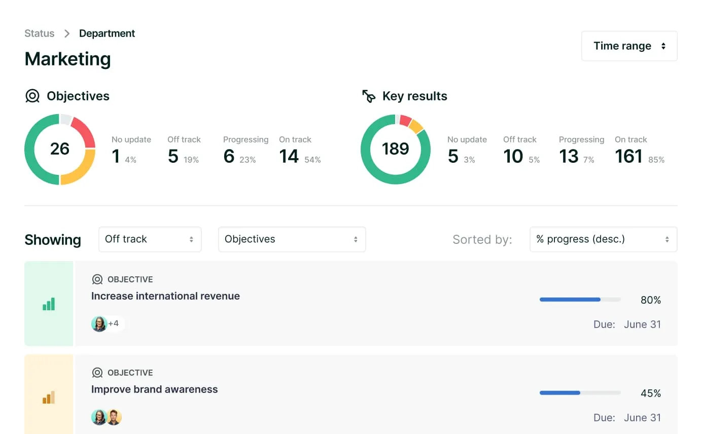 Individual, team, and department goals ladder and connect, making it easy to see how everyone aligns around key business outcomes.