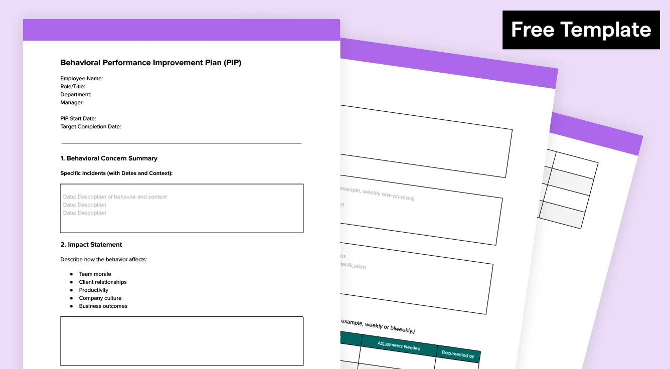 This free Behavioral Performance Improvement Plan (PIP) Template helps managers address conduct-related concerns — like communication breakdowns, professionalism, reliability, compliance violations, or team dynamics — with clarity, objectivity, and fairness.